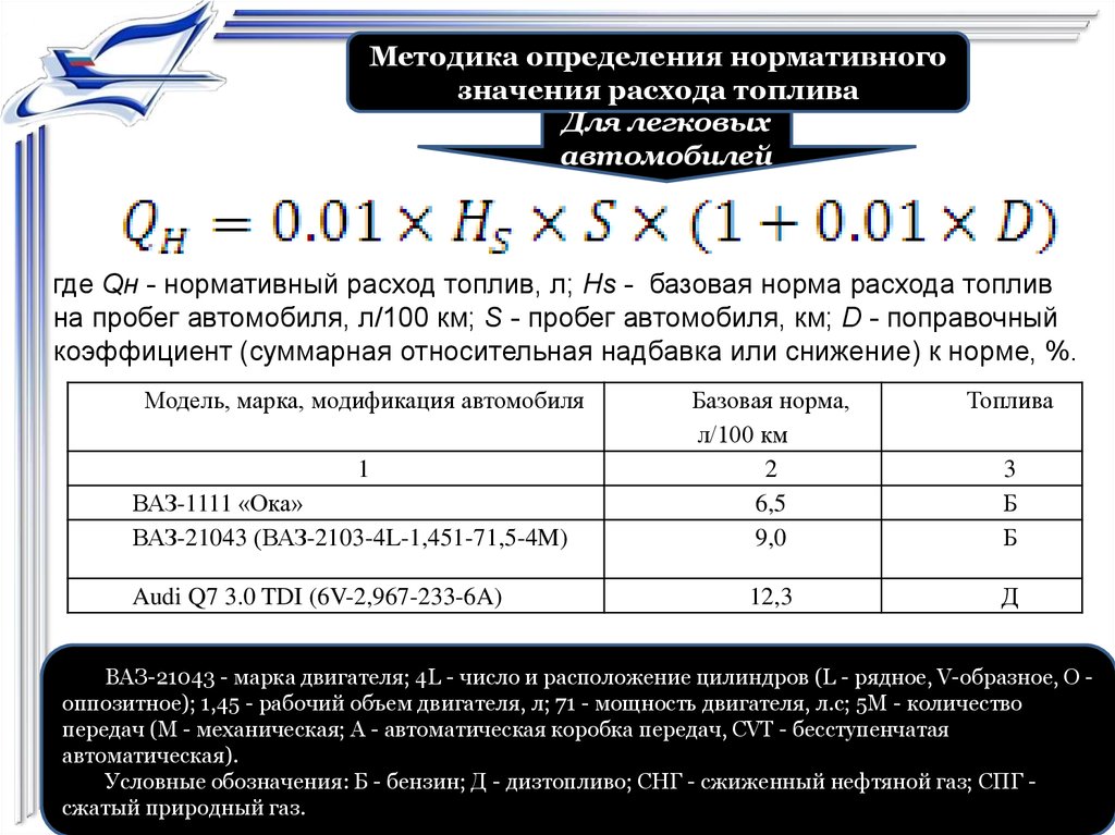 В настоящее время действуют линейные нормы расхода топлива, введенные в 1985 г. постановлением Госплана СССР.