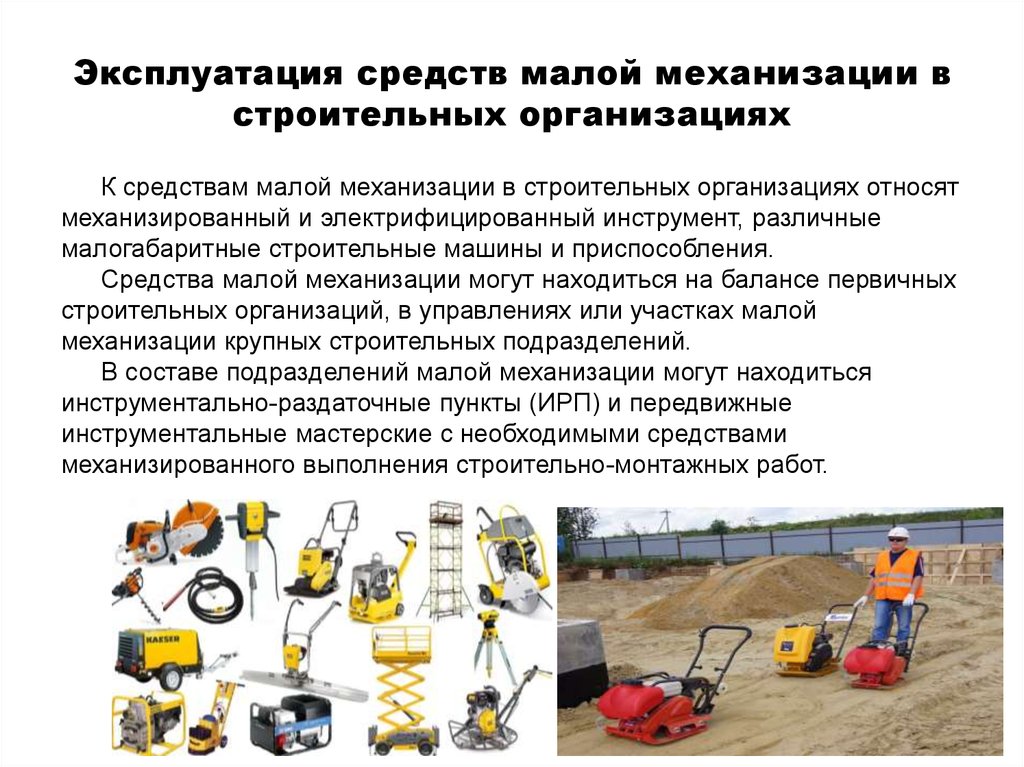 Средства малой механизации подразделяют на электрифицированные, пневматические, моторизованные, гидравлические и пороховые; некоторые инструменты приводятся в действие мускульной силой рабочего.