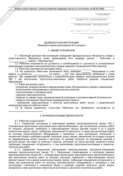 Предлагаем Вашему вниманию типовой пример должностной инструкции машинист крана автомобильного 4-го разряда, образец 2022 года.