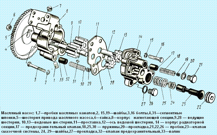 1 — промежуточная шестерня привода; 2 — втулка промежуточной шестерни; 3 — упорный фланец; 4 — ось промежуточной шестерни; 5 — штифт; 6 — шестерня привода; 7 и 23 — шпонки; « — ведущий валик; 9 и 11 — втулки корпуса нагнетающей секции; 10 — корпус нагнетающей секции; 12 — болты крепления корпуса нагнетающей секции; 13 — ведомая шестерня нагнетающей секции; 14 — проставка; 15 — ведомая шестерня радиаторной секции; 16 — ось ведомых шестерен; 17 и 19 — втулки корпуса радиаторной секции; 18— корпус радиаторной секции; 20 — ведущая шестерня радиаторной секции; 21 — стопорный шарик; 22 — ведущая шестерня нагнетающей секции; 24 — болт крепления оси промежуточной шестерни; 25 — штифт установки насоса; 26 — болт крепления упорного фланца; 27 — штифт установки упорного фланца; 28 — установочная втулка; 29 — корпус предохранительного клапана; 30 — плунжер клапана; 31 — пружина; 32 — колпачок; 33 — шплинт; 34 — регулировочная шайба; 35 — редукционный клапан.