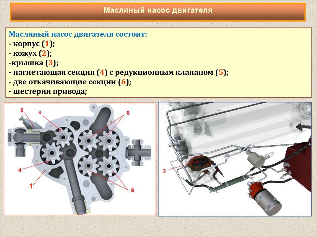 Масляный насос двигателя ЯМЗ-238НБ состоит из нагнетающей и радиаторной секций. Нагнетающая секция подает масло в смазочную систему двигателя, а радиаторная — прокачивает его через масляный радиатор.
