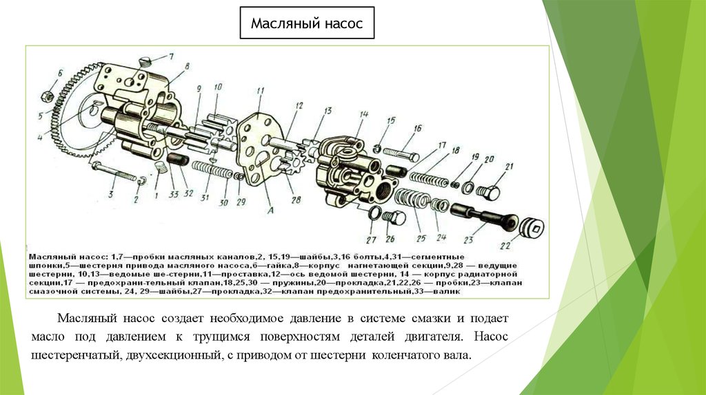 Масляный насос предназначен для подачи масла под определенным давлением к трущимся поверхностям деталей двигателя. В смазочных системах применяют шестеренные насосы.