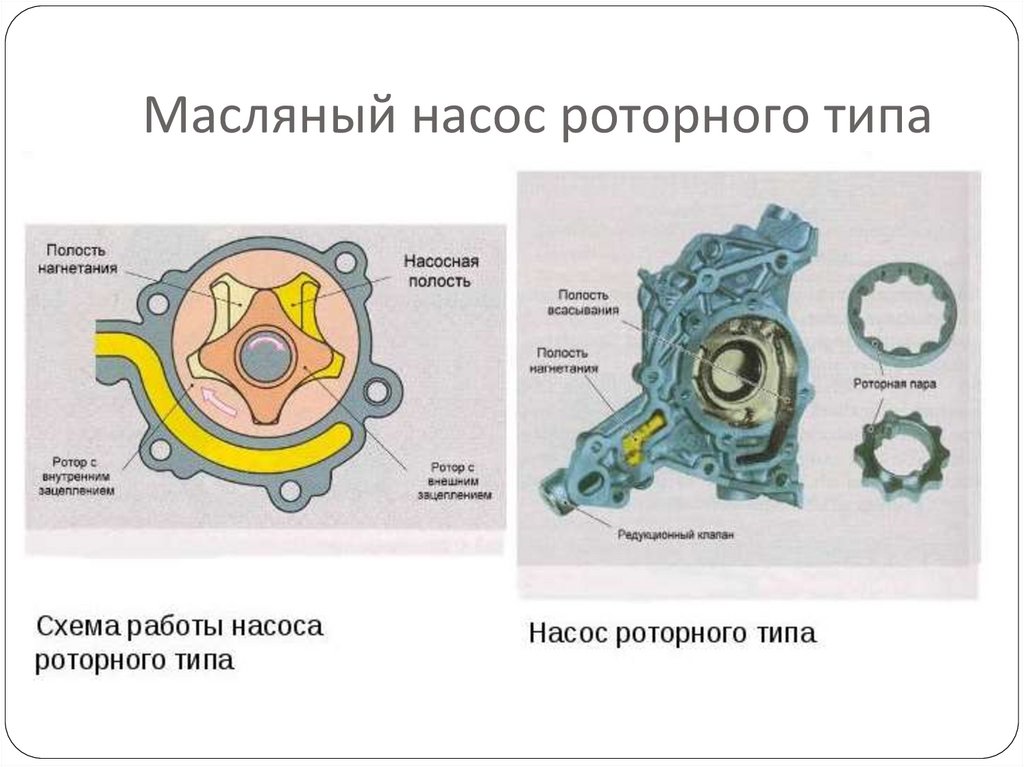Роторные масляные насосы : Роторные масляные насосы состоят из двух различных роторов, которые зацепляются друг с другом: внутреннего ротора и внешнего ротора. Масло сжимается между двумя роторами и под давлением возвращается в двигатель.