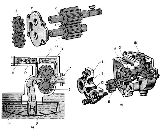В шестеренном насосе к внутреннему колесу эксцентрично расположено внешнее зубчатое колесо, находящееся в корпусе насоса. Как и в обыкновенном зубчатом насосе, масло транспортируется в промежуточные пространства между зубьями. При продолжающемся вращении насоса с одной стороны, в которой зубья движутся по направлению друг от друга, образуется зона пониженного давления. Это всасывающая сторона насоса. А в месте, где зубья снова сцепляются друг с другом, создается повышенное давление. Здесь имеет место выталкивание масла под давлением. Преимущество шестеренчатых насосов по отношению к обыкновенным зубчатым заключается в более высокой мощности насоса, особенно при малой частоте вращения.