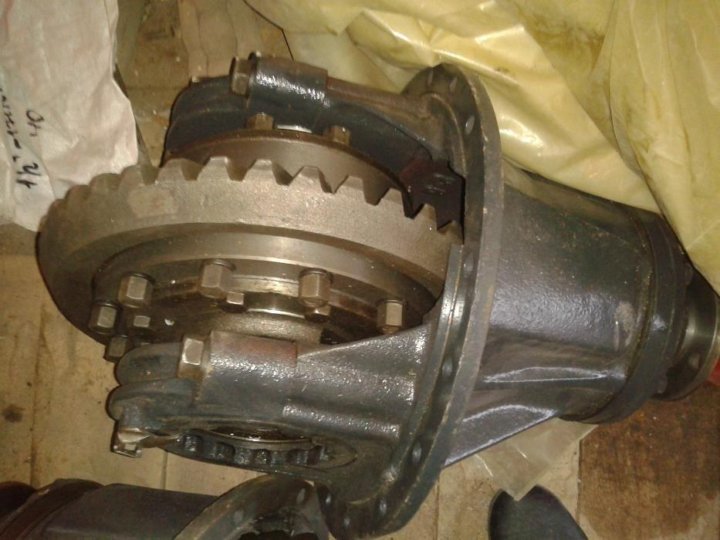 С мая 1967 г. между полуосевой шестерней и чашкой дифференциала устанавливаются две шайбы: стальная, зафиксированная от проворачивания, и бронзовая плавающего типа. Последняя расположена между стальной шайбой и полуосевой шестерней. К чашкам дифференциала приварены черпаки, обеспечивающие обильную подачу смазки к деталям дифференциала. На наружные обработанные поверхности ступиц чашек дифференциала устанавливаются конические роликоподшипники 6 и 24, с помощью которых дифференциал опирается на отверстия картера редуктора, образованные приливами в картере и двумя разъемными крышками 7 и 27.