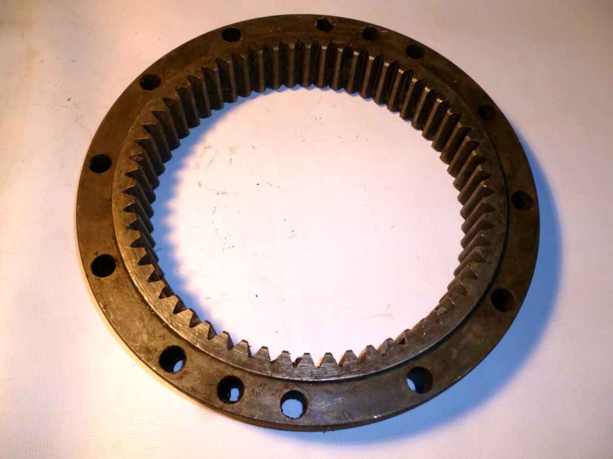 В собранных чашках водила одновременно обрабатываются (растачиваются) три отверстия под оси сателлитов, так как от точности взаимного расположения сателлитов относительно солнечной и коронной шестерен зависит правильность зацепления зубчатой передачи, а также долговечность шестерен. По-этому совместно обработанные чашки колесной передачи метятся порядковым номером и по отдельности теряют взаимозаменяемость при соединении с другими чашками. В приливах наружной чашки под расточки для осей сателлитов имеются резьбовые отверстия под стопорные болты 3 осей сателлитов. Поверхности чашек водила со стороны сателлитов около расточек под оси сателлитов закалены т. в. ч. для уменьшения износа при трении этих поверхностей с торцами сателлитов.