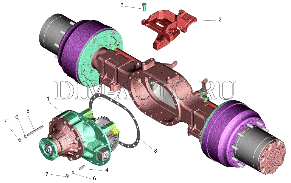 Положение картера относительно балки определяется специальным центрирующим буртиком на привалочном фланце картера редуктора и, кроме того установочными штифтами.