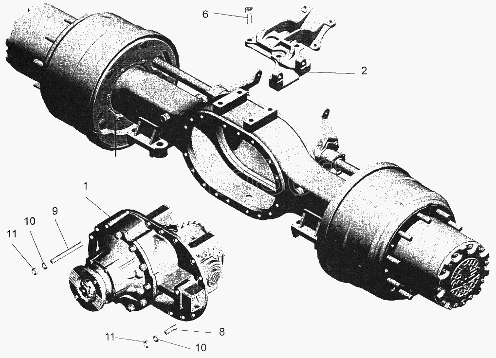 Рядом с рессорными площадками имеются небольшие площадки под резиновые ограничители хода рессор. Внутри картера с каждой стороны сделано по две перегородки; в расточки этих перегородок цилиндрических концов картера запрессовываются кожухи 6 полуосей 7.