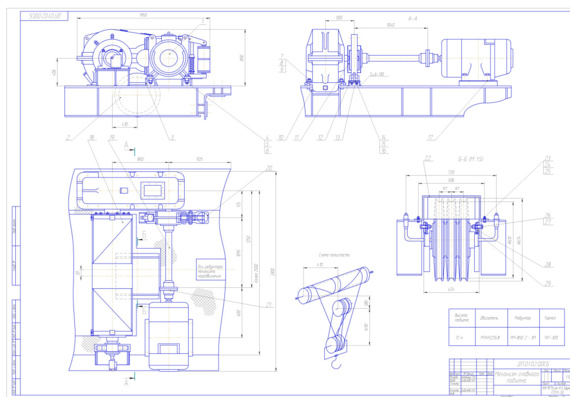 Этот механизм состоит из грузового каната, сбегающего с барабана и огибающего блоки крюковой подвески, обводные блоки и уравнительный блок, редуктора, снабженного тормозом, промежуточного быстроходного вала и приводного электродвигателя. Для выигрыша в тяговом усилии в механизмах подъема используют полиспаст, который представляет собой систему подвижных (в крюковой подвеске) и неподвижных (обводных) блоков. Механизмы подъема кранов грузоподъемностью 80…320 т выполняют по такой же схеме, отличаются они только наличием дополнительной понижающей зубчатой передачи или второго редуктора, с помощью которых выходной вал главного редуктора соединен с барабаном. При этом второй редуктор выполняет функцию быстроходной передачи. Колесо дополнительной зубчатой передачи жестко соединено с барабаном, а шестерня установлена на отдельном валу на опорах и присоединена к выходному валу основного редуктора с помощью зубчатой муфты или установлена на выходном валу редуктора.
