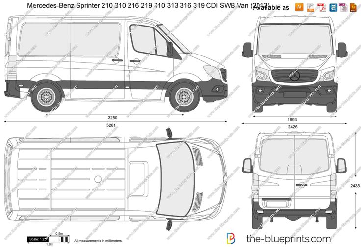 Однако ширина всех фургонов Sprinter составляет 2,43 метра, включая зеркала (1,99 метров без их учета).