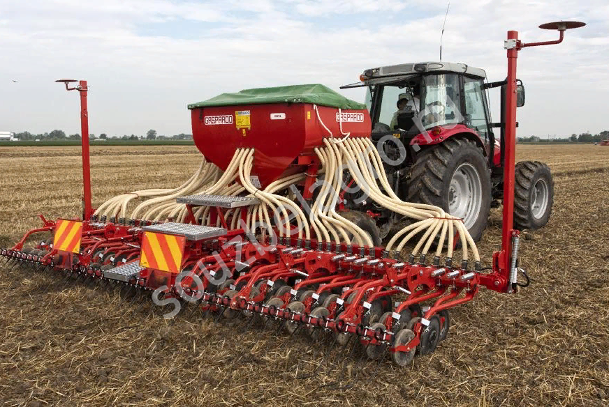 Другие особенности включают вспомогательные колеса для переноски веса, ходовой привод для дозирования семян, погрузочную платформу для загрузки семян и сцепное устройство для буксировки. Можно добавить дополнительные высевающие секции, чтобы преобразовать ее в полноценную сеялку для нулевой обработки почвы.