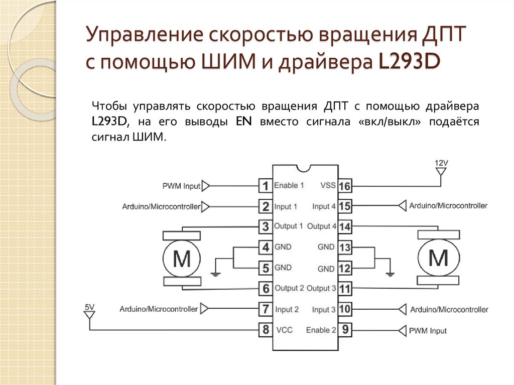| ШИМ | НИЗКИЙ | Вход широтно-импульсной модуляции: сигнал ШИМ на этом контакте соответствует выходу ШИМ на выходах двигателя. |