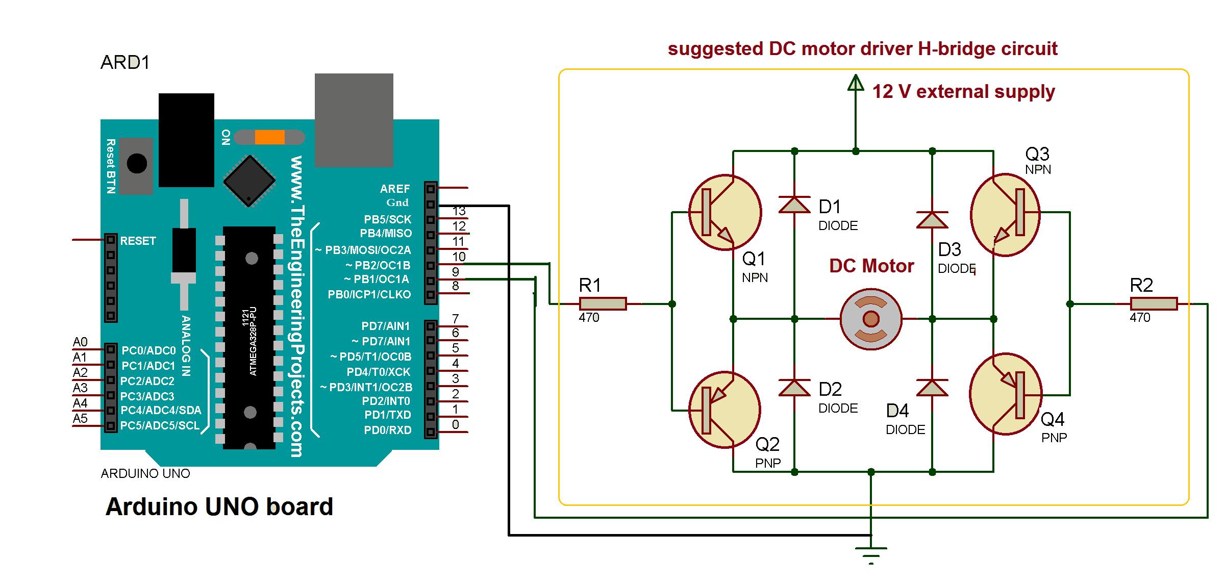 На следующей схеме показаны минимальные соединения, необходимые для взаимодействия этого драйвера двигателя с микроконтроллером: