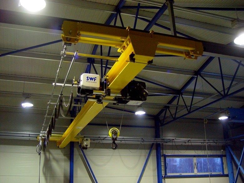 подвесные мостовые краны. Оборудование крепится к нижним полкам двутавровых балок, прикрепленным верхней частью к потолку, фермам или подкрановому пути. Сам кран перемещается по нижней полке балки с внутренней стороны.