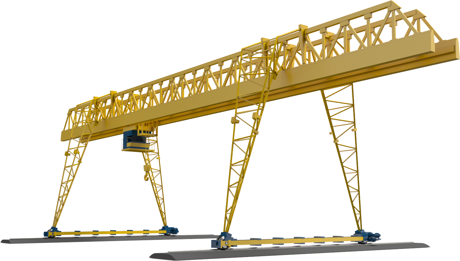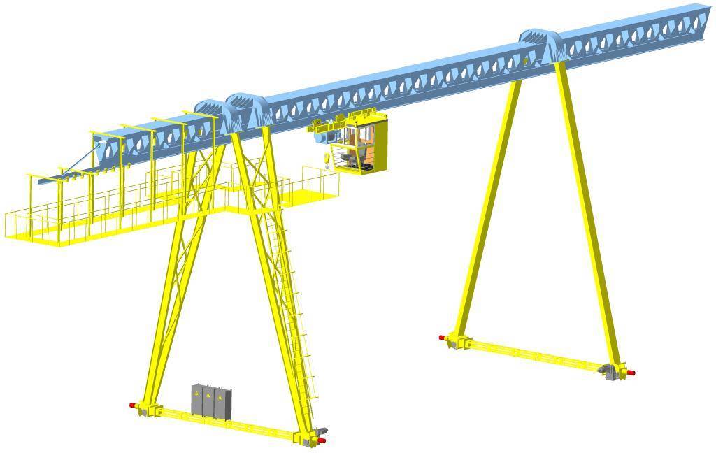 Их питание, так же, как и питание тележки мостового крана, выполняется при помощи кабеля или токопроводящих шин на троллеях. Такой мостовой двухбалочный кран (фото) имеет грузоподъемность до 5 до 500 тонн.