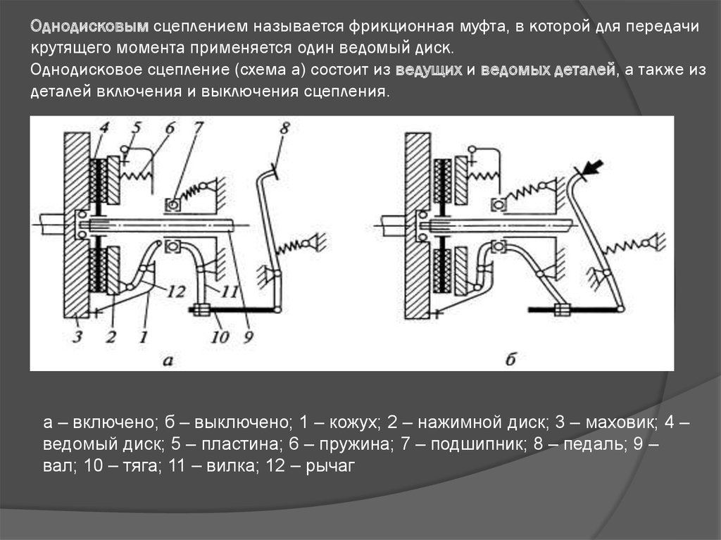Рассмотрим схему и устройство фрикционных муфт сцепления. Однодисковая