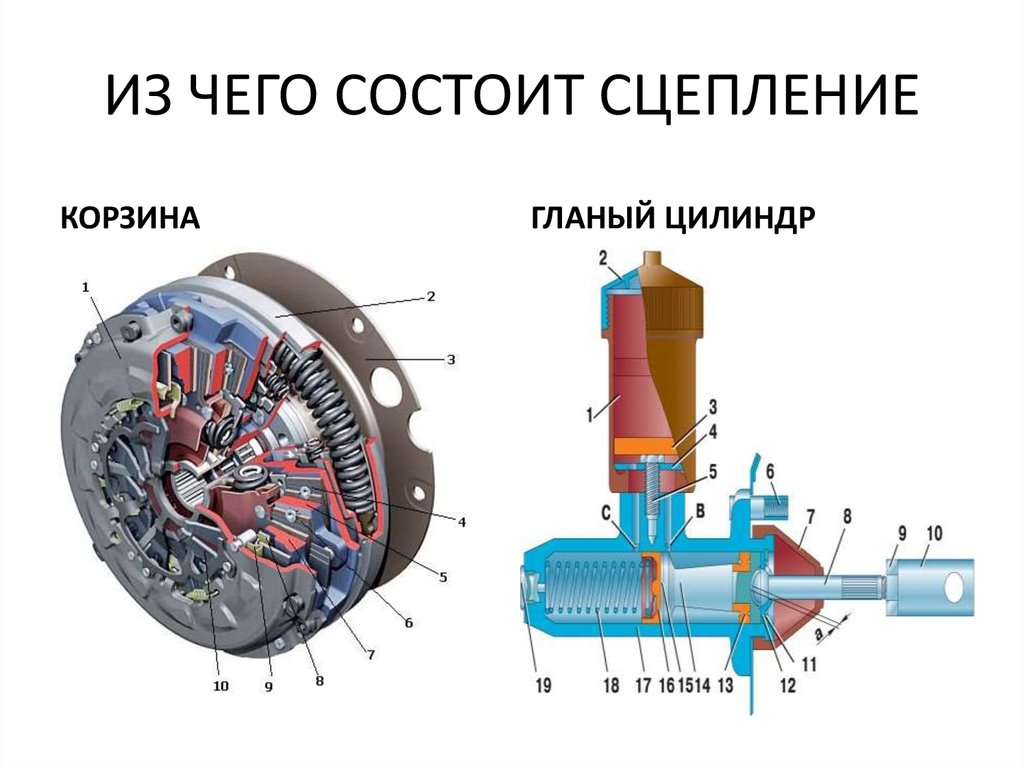 главный и рабочий цилиндр. При нажатии на педаль сцепления (кнопка