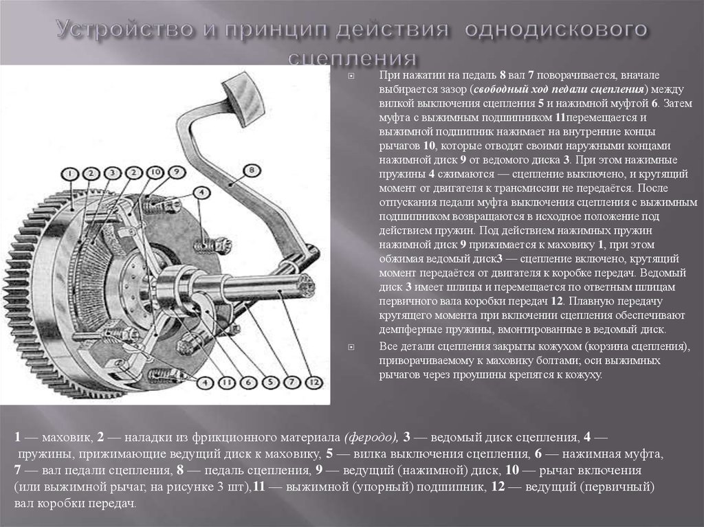 вращаться. Когда вилка сцепления перемещается механизмом выключения, она ЗАЖИМАЕТСЯ на
