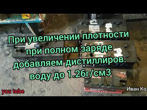 Заряд должен проводиться силой тока 0,1 до напряжения не менее 2,4В на каждом аккумуляторе после чего ток уменьшают вдвое от первоначального и доводят батареи до состояния полного заряда. Заряд следует проводить до достижения обильного газовыделения во всех аккумуляторах, постоянства напряжения и плотности электролита, не изменяющихся в течение 2 ч, после чего при непрекращающемся заряде должна быть произведена корректировка плотности электролита в аккумуляторах до 1,28+0,01 г/см3, приведенной к 25 °С. Если при заряде плотность электролита превысит указанное значение, необходима корректировка ее до нормы путем доливки дистиллированной воды. Перед доливкой часть электролита из аккумуляторов отбирается резиновой грушей. После доливки необходимо продолжить заряд в течение 30—40 мин для перемешивания электролита. Если при доливании дистиллированной воды плотность электролита станет ниже требуемой, необходимо откорректировать ее путем доливки серной кислоты плотностью 1,40 г/см3 и также продолжить заряд для перемешивания электролита 30—40 мин.
