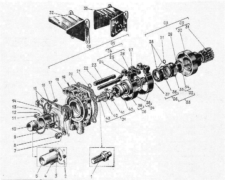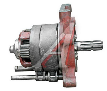 1 — Плита, 2 — Крышка ВОМ, 3 — Прокладка, 4 — Оси, 5 — Вал заднего ВОМ, 6 — Подшипники, 7 — Тормозные ленты с накладками, 8 — Подшипник, 9 — Втулка, 10 — Барабан, 11 — Солнечная шестерня, 12 — Водило, 13 — Сателлит, 14 — Ось сателлита, 15 — Подшипник, 16 — Шестерня коромысла, 17 — Стакан, 18 — Подшипник, 19 — Стопорные кольца, 20 — Вал, 21 — Муфта, 22 — Кожух ВОМ.