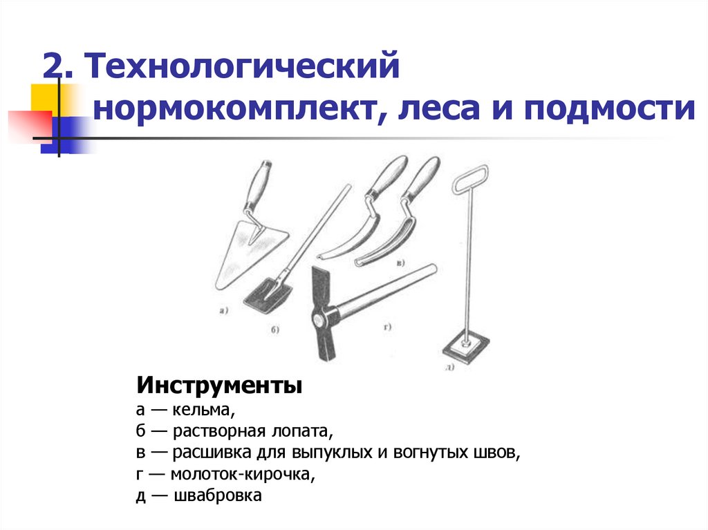 Блочные ИРП оснащают нормокомплектами механизированного инструмента, средств малой механизации, приспособлений и инвентаря. Нормокомплекты рассчитаны на производство основных циклов общестроительных работ — нулевого и надземного, а также отделочных, кровельных и гидроизоляционных работ. При поточном методе строительства блочные ИРП оснащают одним из указанных нормокомплектов и перемещают вместе с комплексными механизированными бригадами ( КМБ) с объекта на объект в составе потока.
