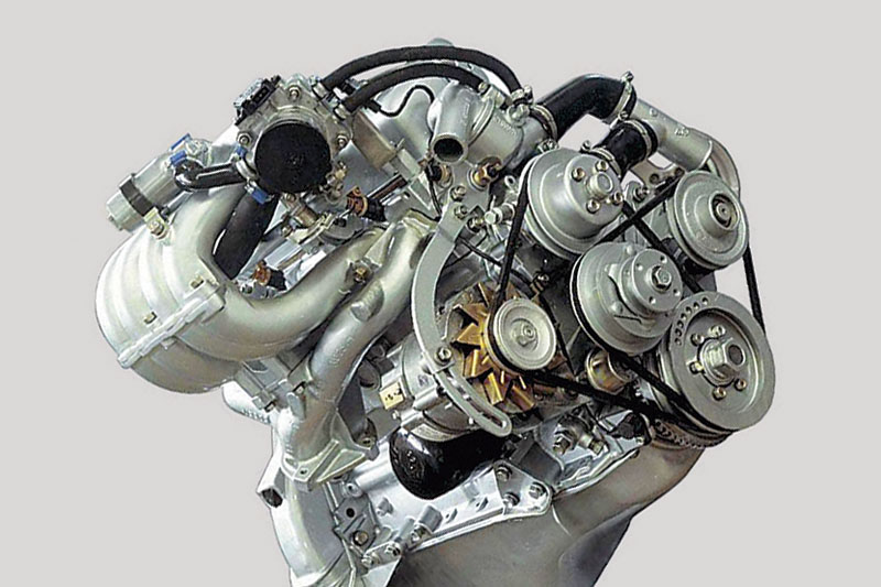 Это позволило увеличить рабочий объем цилиндров до 2,89 литров и, в сравнении с 2,5-литровым мотором, крутящий момент с 170 до 220 Н.м, а мощность – с 90 до 115 лошадиных сил. В производстве этого мотора решили отказаться от сменных чугунных гильз и залили их в алюминиевый блок навечно – создали новый блок цилиндров. Казалось бы, удобный случай отказаться от древнего и капризного масляного картера с четырьмя прокладками, опустить разъем ниже оси коленчатого вала, сделав тем самым блок жестче и уменьшив вероятность утечек масла. Однако поддон оставили прежним. Еще один просчет выявился в процессе эксплуатации, когда приходило время растачивать гильзы. Не на каждом станке оказывался «хобот» нужной длины, если его не хватало, и ход был недостаточным, приходилось выкручивать шпильки головки. Надежно вкрутить их обратно не всегда удавалось, одна или две выползали из блока, приходилось нарезать резьбу большего диаметра. Не совсем удачно заводчане снабдили блок приводных шкивов коленвала резиновым гасителем крутильных колебаний.