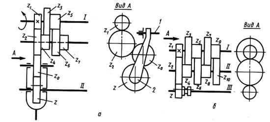 Понятно, что одновременно все три пары зубчатых колес не могут быть включены, так как один и тот же ведомый вал II не может одновременно получать несколько различных скоростей вращения.