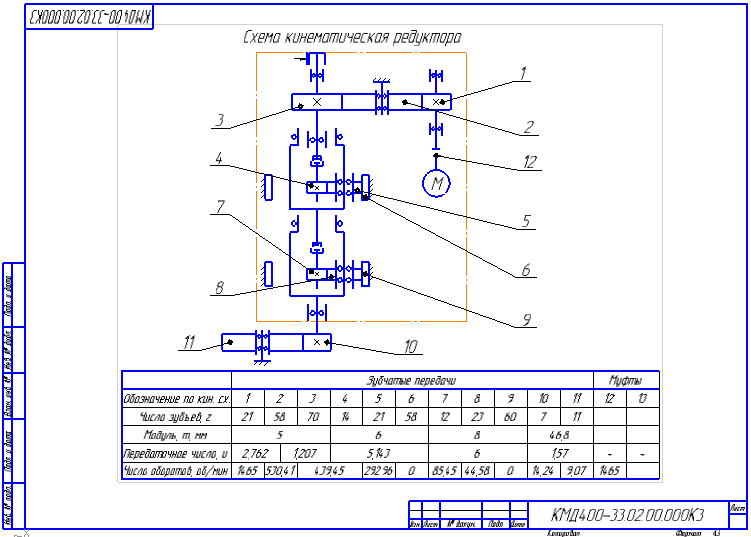 При составлении кинематической схемы все валы последовательно обозначаются римскими цифрами; шестерни, участвующие в передаче, — числом зубьев или порядковым номером, червяки — числом заходов; реечные шестерни — числом зубьев и модулем и т. п. Муфты обычно обозначаются прописными буквами: втулки, сидящие на валах, — номером вала с буквенным индексом; например, III-а — втулка, сидящая на валу III.
