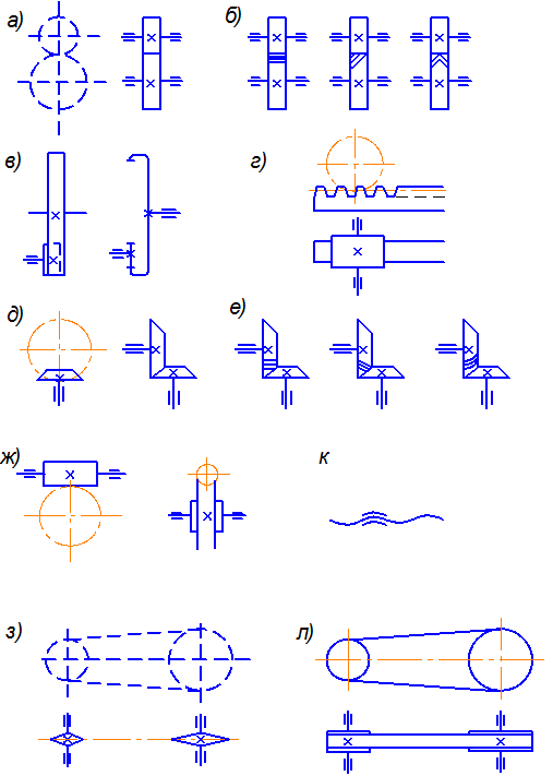 В кинематических схемах каждую деталь или узел показывают условными обозначениями. Чертежи в машиностроении; условные обозначения для кинематических схем), которые уже изучены ранее.
