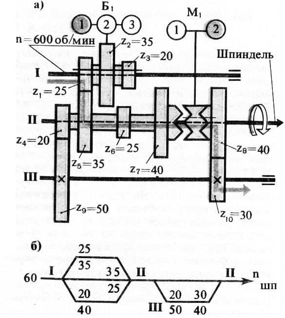 При включении муфты M1 вправо вращение от вала I передается через шестерни z3 и z4 полому шпинделю II, в котором размещается расточный шпиндель III. Последний получает вращение, посредством скользящей шпонки, что необходимо потому, что расточной шпиндель должен иметь осевое перемещение подачи.
