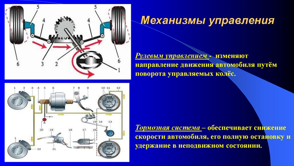 Механизм управления. В него ходят: тормозная система (с помощью нее мы можем останавливаться и удерживаться его на месте) и рулевое управление, которое изменяет угол поворота передних колес, вследствие чего машина меняет направление движения. В связи высокими стандартами безопасности, систем торможения в авто несколько: рабочая, второстепенная и стояночная.