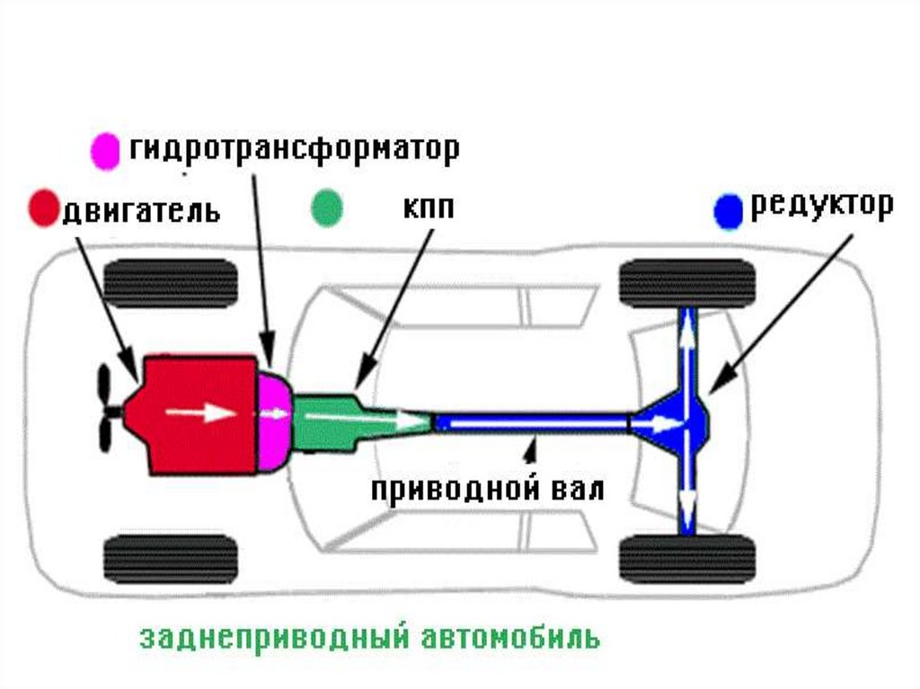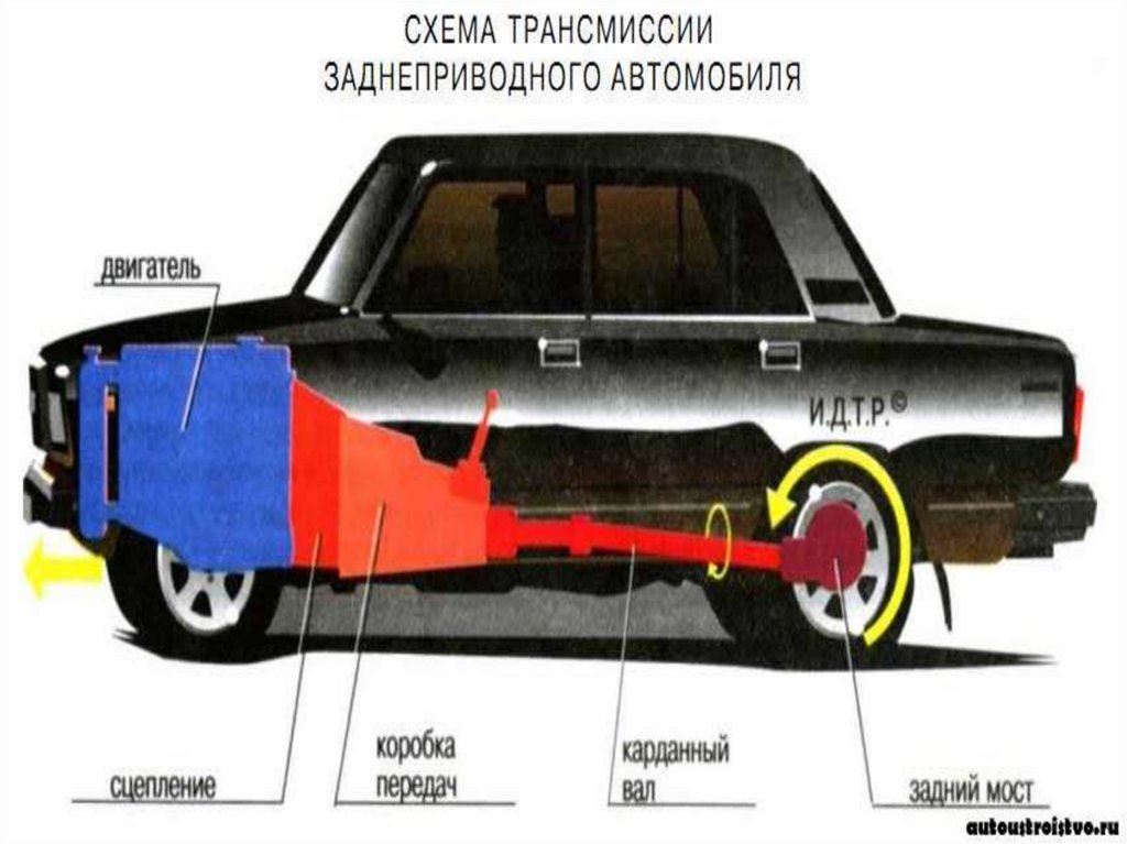 Трансмиссия. Совокупность устройств, передающих силу вращения двигателя к ведущим колесам. Если автомобиль заднеприводный (т.е. ведущие колеса – задние), то компоновка трансмиссии такая: