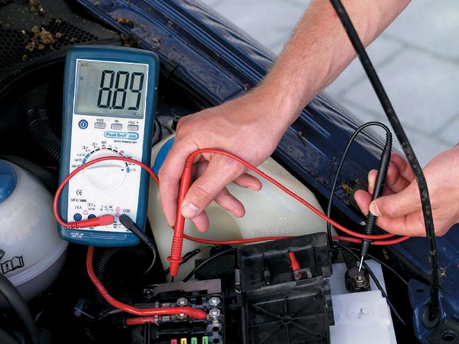 Диагностика рабочего параметра напряжения выполняется с помощью тестера — вольтметра либо мультиметра. Перед проверкой устройство демонтируется с машины либо от него отключаются клеммы. Тестер устанавливается в режим измерения напряжения, а его контакты подключаются к зажимам батареи.