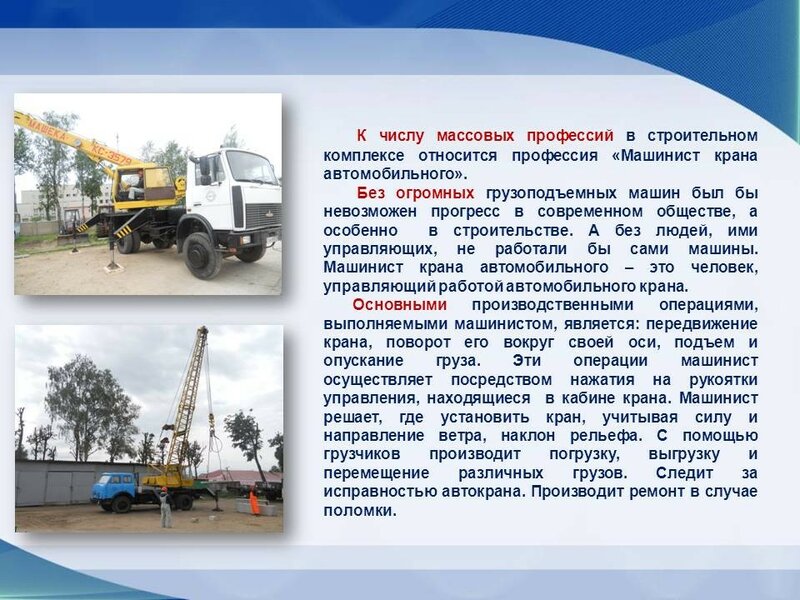 - назначение, устройство, принцип работы и грузовые характеристики обслуживаемых автомобильного крана грузоподъемностью до 20 т (далее – автомобильного крана), а также его конструктивные особенности;