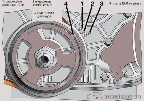 | Четырехцилиндровые двигатели с системой впрыска топлива | JN, DZ/MU*, PM.SD, 3A.AAD | 4-8″ до в. м. т. | 6±1″до в.м.т. | снят (если имеется) | Риска на маховике |