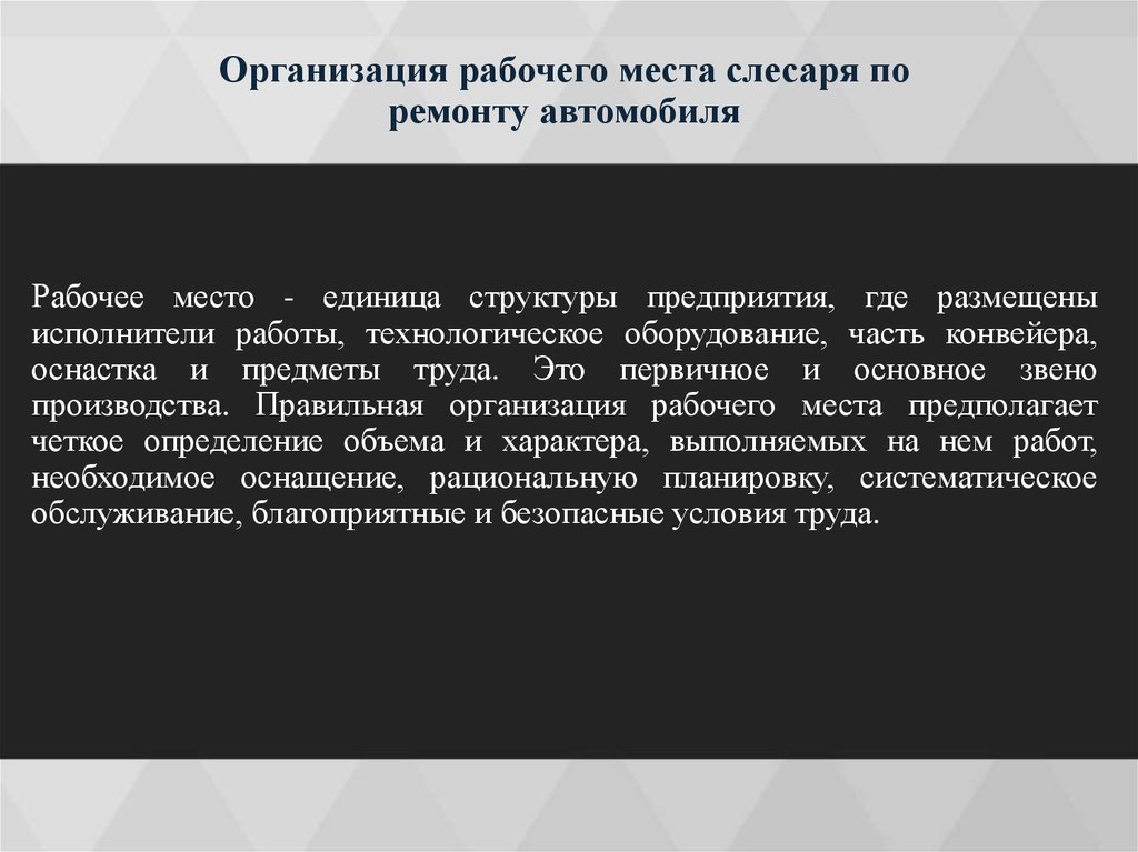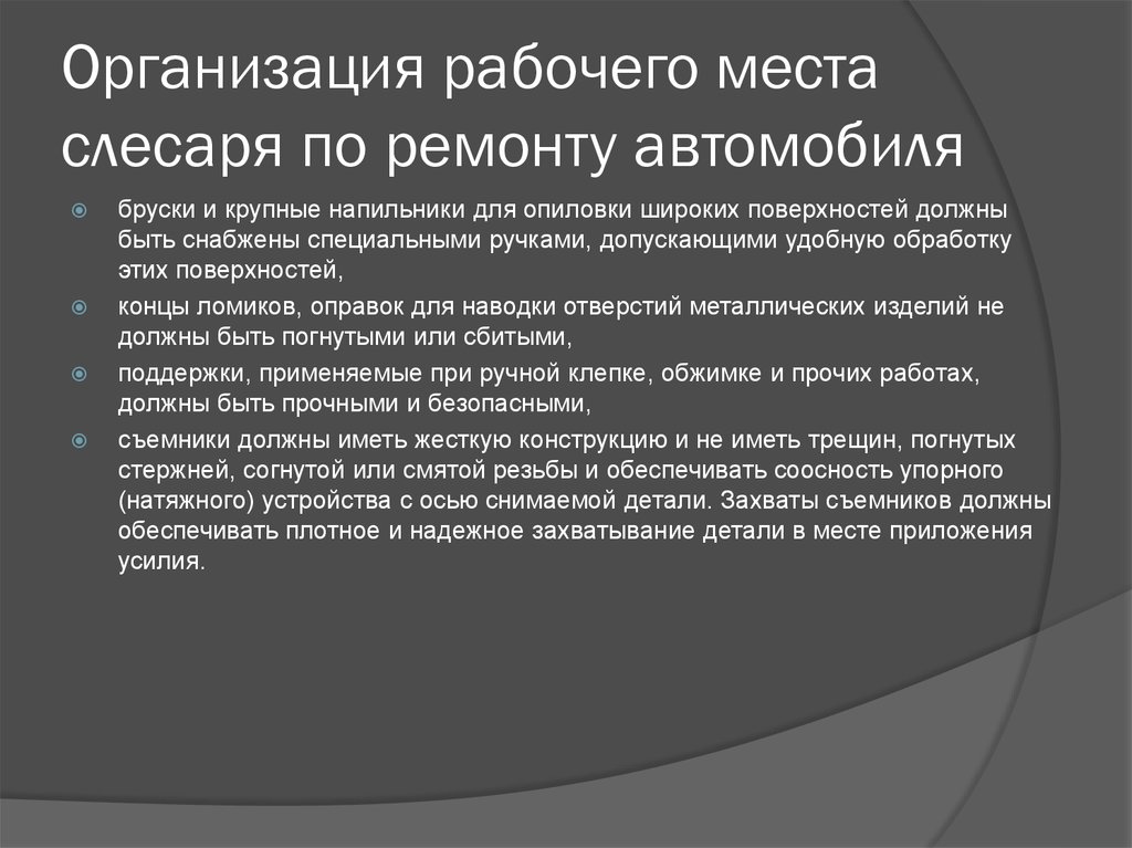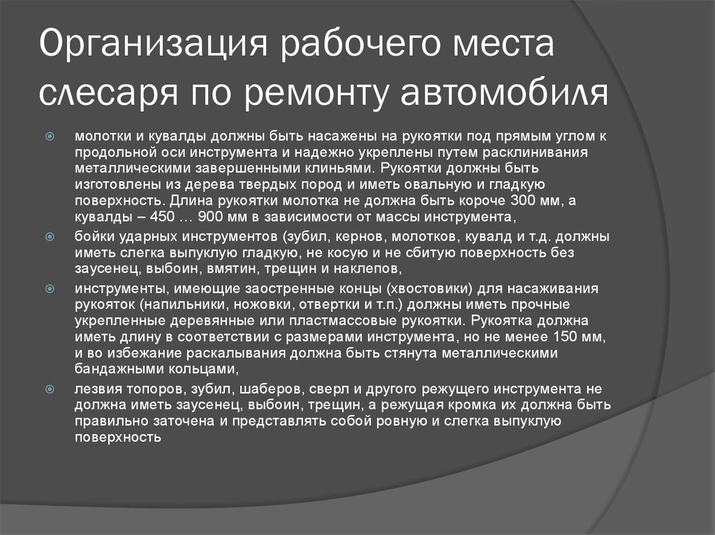 Организация рабочего места слесаря. ПМ.04 Выполнение работ профессии 18511 Слесарь по ремонту автомобилей