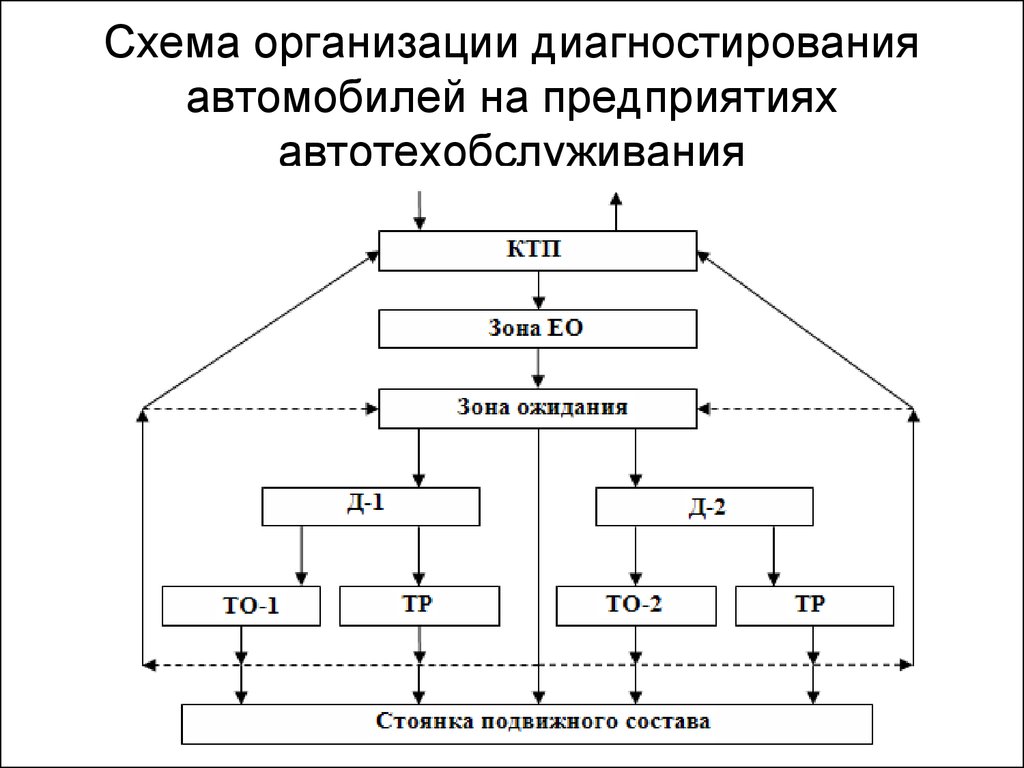 Организация диагностики технического состояния автомобиля зависит от мощности данного автотранспортного предприятия и обеспеченности его соответствующим оборудованием. При этом применяется одна из двух схем организации технологического процесса диагностирования.
