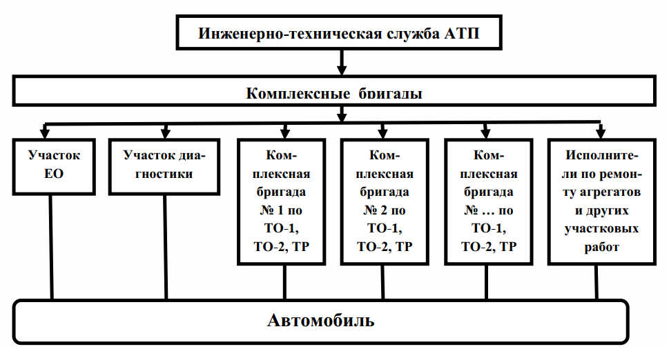 Бригадная форма организации технического обслуживания предусматривает создание бригад для проведения ТО-1, ТО-2 и текущего ремонта.