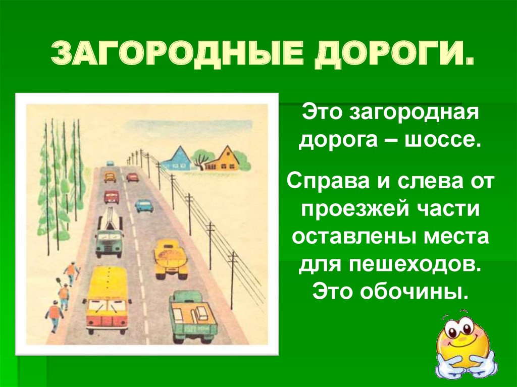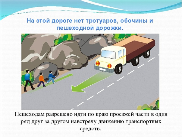 – Но вместо тротуаров по обеим ее сторонам расположены обочины, по которым могут ходить пешеходы. Иногда на обочину могут заезжать и машины. В случае отсутствия обочин на дороге пешеход, идя по проезжей части, должен придерживаться левой стороны, то есть идти навстречу движению транспорта.
