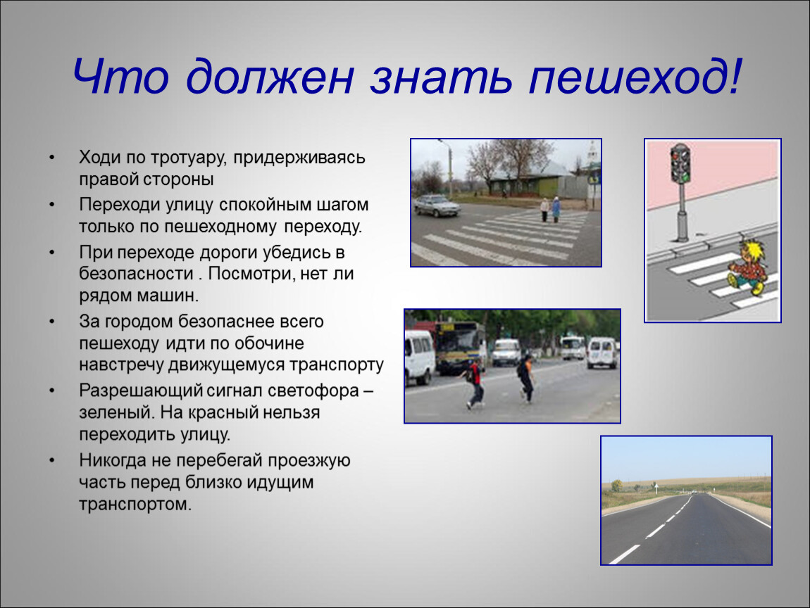 – По проезжей части дороги с большой скоростью движутся автомобили, поэтому выходить на нее опасно, особенно перед близко идущим транспортом. Автомобиль не может остановиться сразу. После нажатия на педаль тормоза он ещё некоторое время продолжает движение по инерции и может наехать на пешехода. Поэтому переходить проезжую часть можно, только убедившись, что транспортное средство далеко.