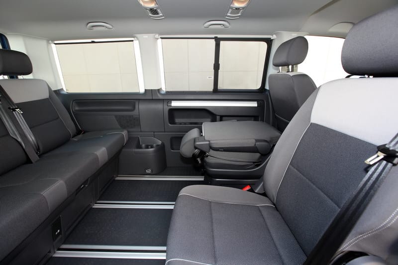 Volkswagen Multivan рассчитан на 5 человек. Количество посадочных мест можно увеличить на 2 (опционально). Сидения «Мультиван» съемные как у «Каравеллы», но прибавку к багажному отделению они дают меньше. Объем фургона равен будет лишь 5,8 м³.