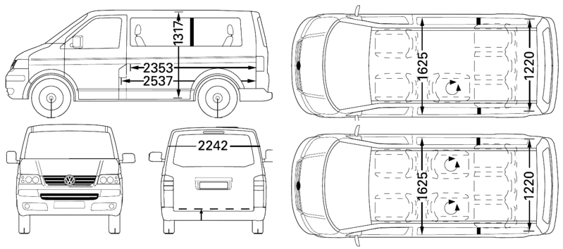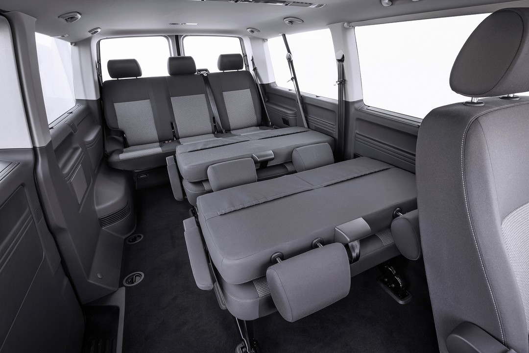 Multivan вы сможете отличить и снаружи: другие бамперы, окрашенные в цвет кузова и сдвижная дверь слева выдают этот микроавтобус премиум-класса. Легко трансформируемый салон позволит перевозить вам грузы, но……… это кощунство! Трансформация салона в Мультивен предназначена, в первую очередь, не для перевозки грузов, а для КОМФОРТА каждого из пассажиров. Даже пассажировместимость ограничена 7 местами! Меньше народа — больше кислорода, хотя есть система климатконтроля для водителя, переднего и задних пассажиров. Каждое сиденье снабжено регулировкой наклона спинки, 2 сиденья вращаются на 360гр, а задний диван можно разложить и превратить в спальные места. Многочисленные ящички для вещей, раскладной столик, тонировка стекол и шторки на всех окнах превращают салон микроавтобуса в уютную каюту для дальних путешествий. Максимальный список доп. опций, системы активной и пассивной безопасности — все самое лучшее и современное в Мультивен.