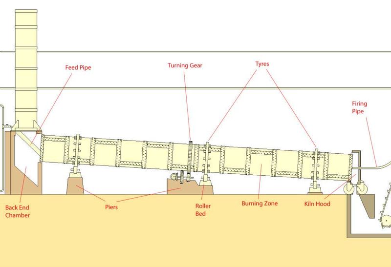 Металлический цилиндр устанавливается так, чтобы был незначительный наклон к горизонту – не более 2 градусов. Процесс изготовления извести начинается с загрузки известняка из бункера в барабан. Это делается с той стороны, которая выше. Благодаря наклону и вращению цилиндра известняк постепенно перемещается к противоположному краю. При этом происходит нагревание сырья до 900-1000 °С. Нужная температура достигается путем сжигания топлива в горячей головке.