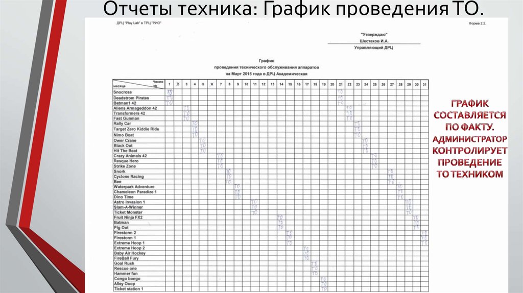 ________________________ Π³Π»Π°Π²Π½ΡΠΉ ΠΈΠ½ΠΆΠ΅Π½Π΅Ρ " " ____________ 19 Π³. 10.4. ΠΠΠΠΠΠΠ ΠΠΠΠ-ΠΠ ΠΠ€ΠΠ ΡΠ΅Ρ Π½ΠΈΡΠ΅ΡΠΊΠΎΠ³ΠΎ ΠΎΠ±ΡΠ»ΡΠΆΠΈΠ²Π°Π½ΠΈΡ ΠΈ ΡΠ΅ΠΌΠΎΠ½ΡΠ° ΠΎΠ±ΠΎΡΡΠ΄ΠΎΠ²Π°Π½ΠΈΡ ________________________________________ Π½Π° 19 Π³. -------------------------------------------------------------------------------------------------------------------------------------------- ΠΠ°ΠΈΠΌΠ΅-Β¦Π’ΠΈΠΏ ΠΈΒ¦ΠΠ½- Β¦Π Π΅ΠΌΠΎΠ½ΡΠΎ- Β¦Π‘ΠΌΠ΅Π½-Β¦Π Π΅- Β¦ΠΠ°ΡΠ° Β¦ ΠΡΠ°ΡΠΈΠΊ ΠΏΠ΅ΡΠΈΠΎΠ΄ΠΈΡΠ½ΠΎΡΡΠΈ ΡΠ΅Ρ Π½ΠΈΡΠ΅ΡΠΊΠΎΠ³ΠΎ ΠΎΠ±ΡΠ»ΡΠΆΠΈΠ²Π°Π½ΠΈΡ ΠΈ ΡΠ΅ΠΌΠΎΠ½ΡΠ° Β¦ΠΠΎΠ»ΠΈ- Β¦ΠΠ±ΡΠ΅Π΅ Π²ΡΠ΅ΠΌΡ Π² Β¦ΠΡΠ΅Π³ΠΎ Π½ΠΎΠ²Π°- Β¦ΠΌΠ°ΡΠΊΠ°Β¦Π²Π΅Π½-Β¦ΡΠ»ΠΎΠΆΠ½ΠΎΡΡΡ Β¦Π½ΠΎΡΡΡΒ¦ΠΌΠΎΠ½Ρ-Β¦ΠΏΠΎΡ- Β¦ Β¦ΡΠ΅ΡΡΠ²ΠΎ Β¦ Π½ΠΎΡΠΌΠΎ-ΡΠ°ΡΠ°Ρ Β¦ Π½ΠΈΠ΅ Β¦ΠΎΠ±ΠΎ- Β¦ΡΠ°Ρ-Β¦ Β¦ΡΠ°Π±ΠΎ-Β¦Π½ΡΠΉ Β¦Π»Π΅Π΄- Β¦ Β¦ΡΠ΅ΠΌΠΎΠ½ΡΠΎΠ²Β¦ Β¦ ΠΎΠ±ΠΎΡΡ-Β¦ΡΡΠ΄ΠΎ-Β¦Π½ΡΠΉ Β¦ Β¦ΡΡ Β¦ΡΠΈΠΊΠ» Β¦Π½Π΅Π³ΠΎ Β¦ Β¦ΠΈ ΡΠ΅Ρ Π½ΠΈ-Β¦ Β¦ Π΄ΠΎΠ²Π°- Β¦Π²Π°Π½ΠΈΡΒ¦Π½ΠΎ- Β¦ Β¦ Β¦ Β¦ΠΊΠ°ΠΏΠΈ-Β¦ Β¦ΡΠ΅ΡΠΊΠΈΡ Β¦ Β¦ Π½ΠΈΡ Β¦ Β¦ΠΌΠ΅Ρ Β¦ Β¦ Β¦ Β¦ΡΠ°Π»Ρ-Β¦ Β¦ΠΎΠ±ΡΠ»ΡΠΆΠΈ-Β¦ Β¦ Β¦ Β¦ Β¦ Β¦ Β¦ Β¦Π½ΠΎΠ³ΠΎ Β¦ Β¦Π²Π°Π½ΠΈΠΉ Π² Β¦ Β¦ Β¦ Β¦ Β¦ Β¦ Β¦ Β¦ΡΠ΅- Β¦ Β¦Π³ΠΎΠ΄ Β¦ Β¦ Β¦ Β¦ +------------+ Β¦ Β¦ΠΌΠΎΠ½ΡΠ°+-------------------------------------------------------------+--------+--------------+ Β¦ Β¦ Β¦ΠΌΠ΅Ρ Π°-Β¦ΡΠ»Π΅ΠΊΡ-Β¦ Β¦ Β¦ Β¦ΡΠ½- Β¦ΡΠ΅Π²-Β¦ΠΌΠ°ΡΡΒ¦Π°ΠΏ- Β¦ΠΌΠ°ΠΉΒ¦ΠΈΡΠ½ΡΒ¦ΠΈΡΠ»ΡΒ¦Π°Π²- Β¦ΡΠ΅Π½- Β¦ΠΎΠΊ- Β¦Π½ΠΎ- Β¦Π΄Π΅- Β¦Π’ΠΒ¦Π’ Β¦Π Β¦ΡΠ»Π΅-Β¦ΡΡΠΎ-Β¦ΠΏΡΠΎ-Β¦ Β¦ Β¦ Β¦Π½ΠΈ- Β¦ΡΠΈΡΠ΅Ρ-Β¦ Β¦ Β¦ Β¦Π²Π°ΡΡΒ¦ΡΠ°Π»ΡΒ¦ Β¦ΡΠ΅Π»ΡΒ¦ Β¦ Β¦ Β¦Π³ΡΡΡΒ¦ΡΡΠ±ΡΡΒ¦ΡΡΠ±ΡΡΒ¦ΡΠ±ΡΡΒ¦ΠΊΠ°Π±ΡΡΒ¦ Β¦ Β¦ Β¦ΡΠ°Ρ-Β¦Π»ΡΡ-Β¦ΡΠΈΠ΅ Β¦ Β¦ Β¦ Β¦ΡΠ΅Ρ- Β¦ΠΊΠΎΠΉ Β¦ Β¦ Β¦ Β¦ Β¦ Β¦ Β¦ Β¦ Β¦ Β¦ Β¦ Β¦ Β¦ Β¦ Β¦ Β¦ Β¦ Β¦ Β¦Π½ΡΠ΅ Β¦Π½ΡΠ΅ Β¦ Β¦ Β¦ Β¦ Β¦ΠΊΠΎΠΉ Β¦ΡΠ°ΡΡΠΈ Β¦ Β¦ Β¦ Β¦ Β¦ Β¦ Β¦ Β¦ Β¦ Β¦ Β¦ Β¦ Β¦ Β¦ Β¦ Β¦ Β¦ Β¦ Β¦ Β¦ Β¦ Β¦ Β¦ Β¦ Β¦ΡΠ°ΡΡΠΈΒ¦ Β¦ Β¦ Β¦ Β¦ Β¦ Β¦ Β¦ Β¦ Β¦ Β¦ Β¦ Β¦ Β¦ Β¦ Β¦ Β¦ Β¦ Β¦ Β¦ Β¦ Β¦ Β¦ ------+-----+----+-----+------+-----+-----+-----+----+----+----+----+---+----+----+----+-----+-----+----+-----+--+--+--+----+----+----+----- 1 Β¦ 2 Β¦ 3 Β¦ 4 Β¦ 5 Β¦ 6 Β¦ 7 Β¦ 8 Β¦ 9 Β¦ 10 Β¦ 11 Β¦ 12 Β¦13 Β¦ 14 Β¦ 15 Β¦ 16 Β¦ 17 Β¦ 18 Β¦ 19 Β¦ 20 Β¦21Β¦22Β¦23Β¦ 24 Β¦ 25 Β¦ 26 Β¦ 27 ------+-----+----+-----+------+-----+-----+-----+----+----+----+----+---+----+----+----+-----+-----+----+-----+--+--+--+----+----+----+----- Π‘ΠΎΠ³Π»Π°ΡΠΎΠ²Π°Π½ΠΎ: ΠΠ»Π°Π²Π½ΡΠΉ ΠΌΠ΅Ρ Π°Π½ΠΈΠΊ ΠΠ»Π°Π²Π½ΡΠΉ ΡΠ½Π΅ΡΠ³Π΅ΡΠΈΠΊ ΠΠ°ΡΠ°Π»ΡΠ½ΠΈΠΊ ΠΏΠ»Π°Π½ΠΎΠ²ΠΎ-ΠΏΡΠΎΠΈΠ·Π²ΠΎΠ΄ΡΡΠ²Π΅Π½Π½ΠΎΠ³ΠΎ ΠΎΡΠ΄Π΅Π»Π° ΠΠ°ΡΠ°Π»ΡΠ½ΠΈΠΊ ΡΠ΅Ρ Π° ΠΡΠΈΠΌΠ΅ΡΠ°Π½ΠΈΡ.1. ΠΠ° ΠΊΠ°ΠΆΠ΄ΡΡ Π΅Π΄ΠΈΠ½ΠΈΡΡ ΠΎΠ±ΠΎΡΡΠ΄ΠΎΠ²Π°Π½ΠΈΡ Π² ΠΏΠ»Π°Π½Π΅-Π³ΡΠ°ΡΠΈΠΊΠ΅ ΠΎΡΠ²ΠΎΠ΄ΡΡΡΡ Π΄Π²Π΅ Π³ΠΎΡΠΈΠ·ΠΎΠ½ΡΠ°Π»ΡΠ½ΡΠ΅ ΡΡΡΠΎΠΊΠΈ: Π²Π΅ΡΡ Π½ΡΡ - Π΄Π»Ρ ΠΌΠ΅Ρ Π°Π½ΠΈΡΠ΅ΡΠΊΠΎΠΉ, Π° Π½ΠΈΠΆΠ½ΡΡ - Π΄Π»Ρ ΡΠ»Π΅ΠΊΡΡΠΈΡΠ΅ΡΠΊΠΎΠΉ ΡΠ°ΡΡΠΈ. 2. Π Π³ΡΠ°ΡΠΈΠΊΠ΅ ΠΏΠ΅ΡΠΈΠΎΠ΄ΠΈΡΠ½ΠΎΡΡΠΈ ΡΠ΅Ρ Π½ΠΈΡΠ΅ΡΠΊΠΎΠ³ΠΎ ΠΎΠ±ΡΠ»ΡΠΆΠΈΠ²Π°Π½ΠΈΡ ΠΈ ΡΠ΅ΠΌΠΎΠ½ΡΠ° (9 - 20 ΡΡΠΎΠ»Π±ΡΡ) ΠΎΡΠΌΠ΅ΡΠΊΡ Π²ΡΠΏΠΎΠ»Π½Π΅Π½ΠΈΡ ΡΠ°Π±ΠΎΡ Π΄Π΅Π»Π°ΡΡ Π½Π° Π³ΡΠ°ΡΠΈΠΊΠ΅ ΠΊΡΠ°ΡΠ½ΡΠΌ ΠΊΠ°ΡΠ°Π½Π΄Π°ΡΠΎΠΌ.