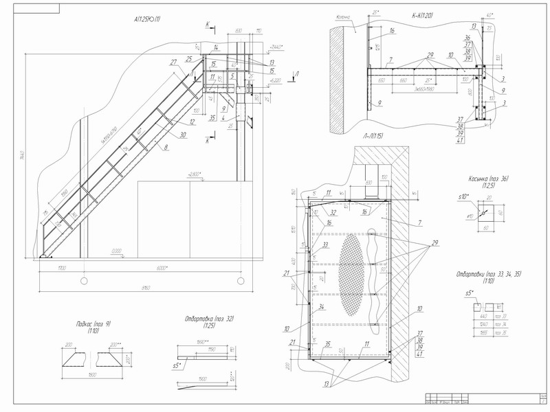 а) площадка и лестница располагаются в плоскости строительных колонн, и вход на мост производится с торца крана через концевую балку (рис. 4. 14, а). Отметка площадки делается на высоте головки под кранового рельса плюс высота концевой балки. Устройство площадки по такому варианту должно быть увязано со строительной частью проекта корпуса.