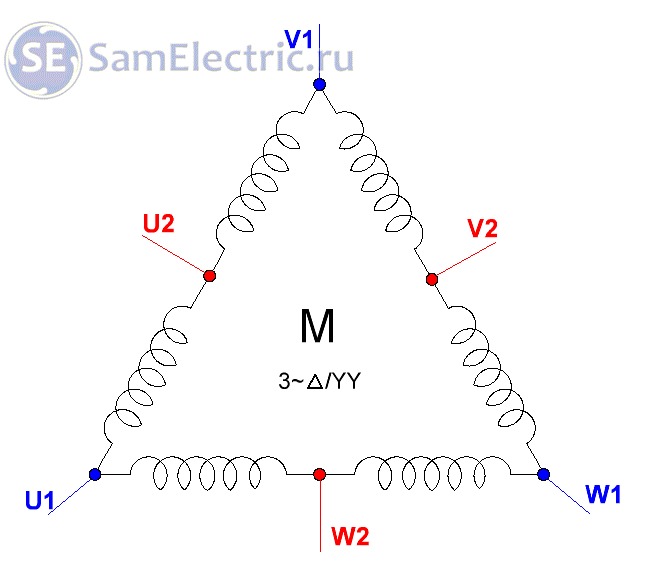 Трехфазные двигатели также рассчитаны на работу при двух разных напряжениях, поэтому катушки могут быть подключены как в высоковольтной, так и в низковольтной конфигурации.