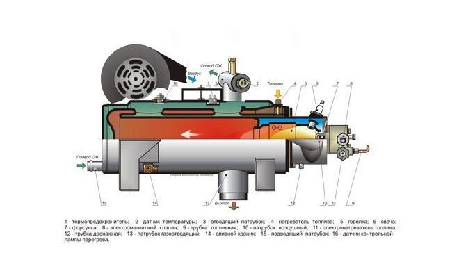 Образовавшаяся смесь воспламеняется и сгорает. Горелка съемная, прикреплена к теплообменнику подогревателя болтами. На горелке установлены электроискровая свеча и топливный электромагнитный клапан в сборе с форсункой и электронагревателем топлива.