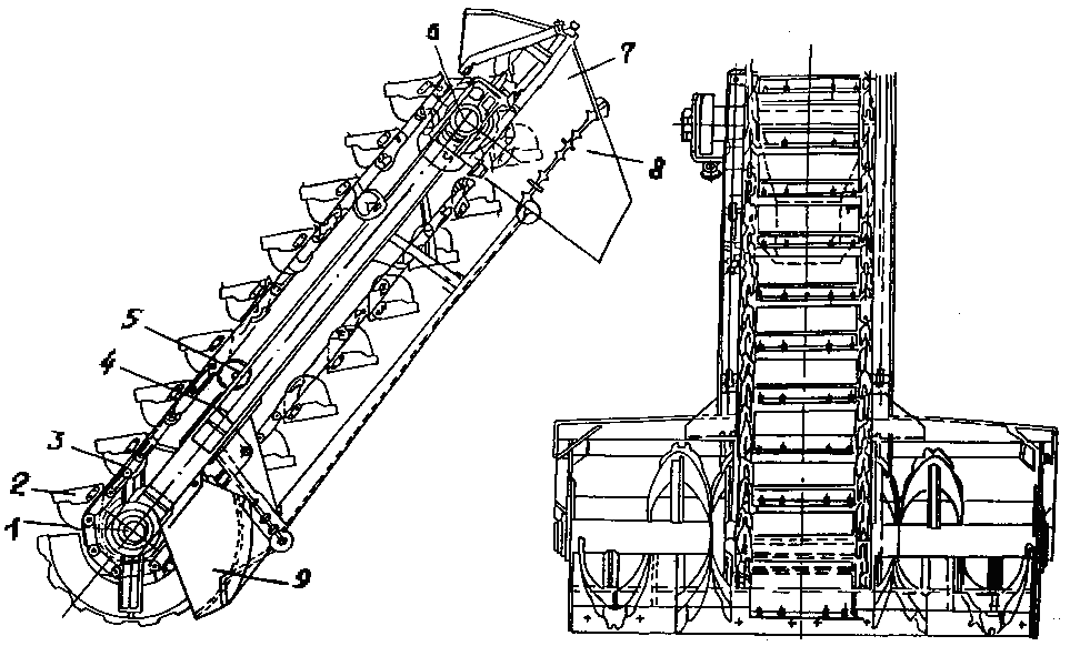 Скребковые погрузчики (транспортеры). Так же, как и шнековые погрузчики, они предназначены для транспортировки зерна, других сыпучих и мелкокусковых грузов. Принцип их работы основан на сплошном волочении груза вдоль желоба, которое осуществляется при помощи цепи со скребками (отсюда и название погрузчика).