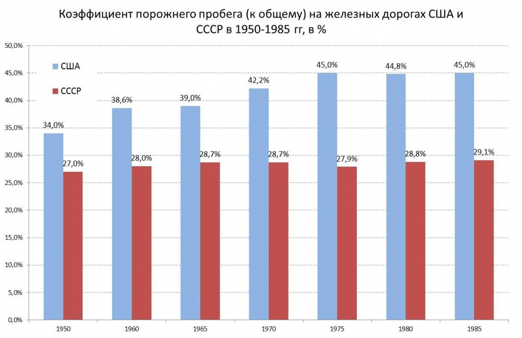 Коэффициенты порожнего пробега во времена СССР были также очень низкими: в 1988 году у полувагона МПС он составлял 27%. У ОАО «РЖД» в 2006-м – 42%.