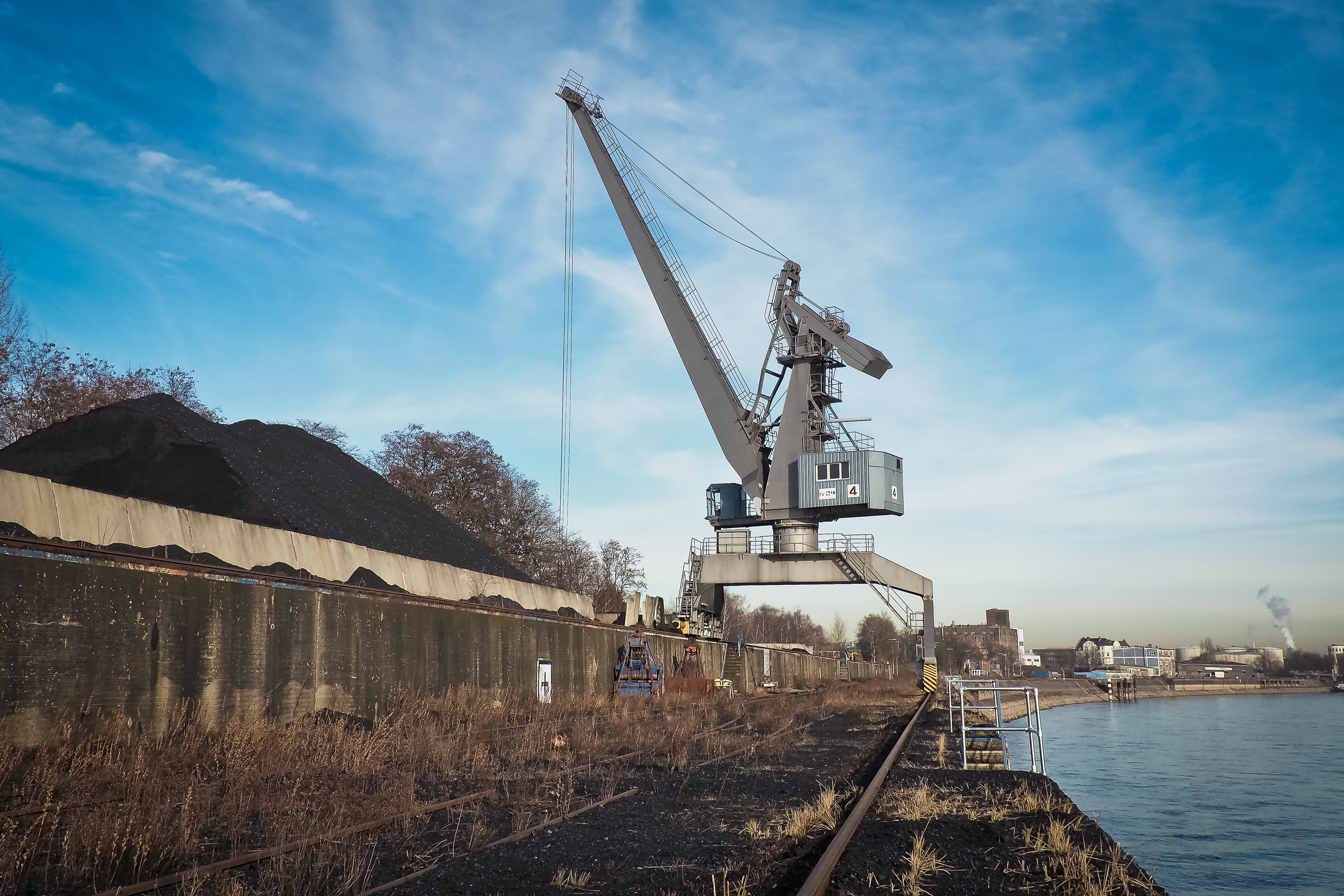 Старый портовый кран на реке Рейн, крупный план. человек остаются дома из-за запрета на поездки и коронавируса (covid-19) вспышка. карантинная зона в майнце, рейнланд-пфальц, германияPREMIUM